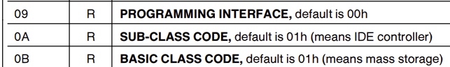 The PCI fields list above shows one big 3-byte chunk for "Class Code," but documentation sometimes referred to the "subclass" field, which I couldn't seem to find anywhere. However, it did seem to be a powerful way to tell what type of device you were dealing with - as an example, class 1 indicates a mass storage device, and class 1 subclass 1 indicates an IDE interface [^3].